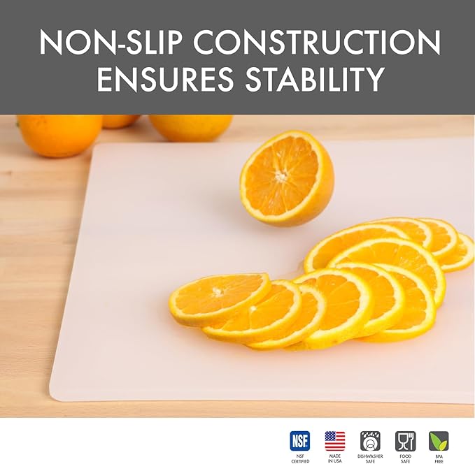 - Durable NSF Certified Polypropylene Material: Crafted from non-porous, non-absorbent polypropylene, this cutting board offers a stain-resistant, easy-to-clean surface that meets FDA and NSF food safety standards.