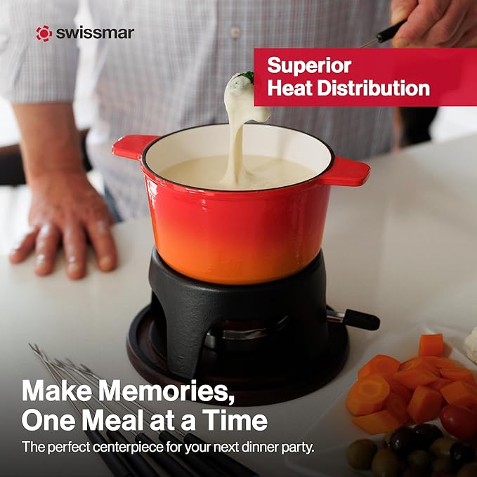 Swissmar Sierra Cast Iron Fondue Set, 1.6 Quart / 1.6 Liter – Perfect for Meat, Cheese, & Chocolate Fondues – Ideal for Family Bonding & Hosting Gifts - 12-Pieces, Gradient Orange