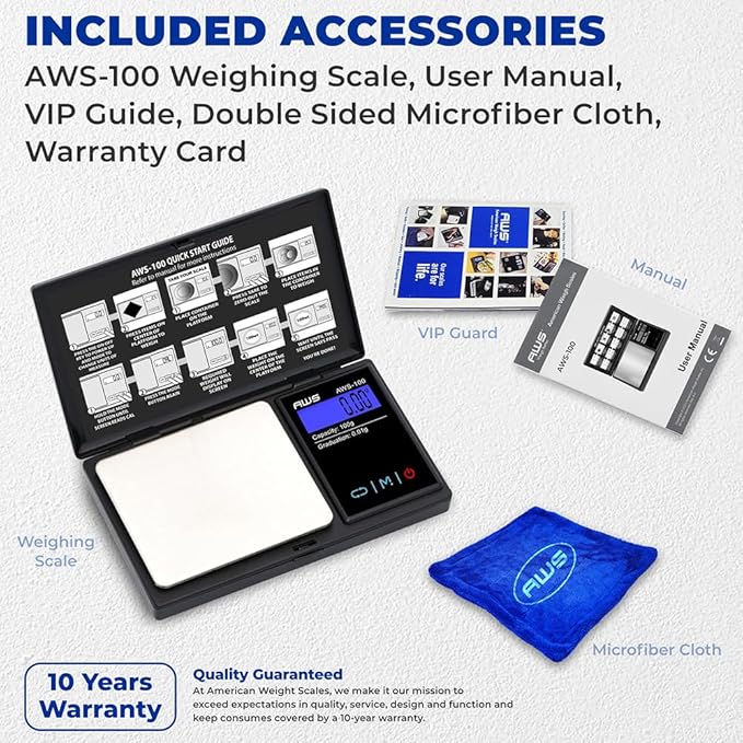 - ACCURACY: The AWS-100 scale boasts a 100g x 0.01g capacity, ensuring precision with every weigh-in. This scale is equipped with high-precision sensors for precise weight readings. Moreover, the protective cover serves as a practical weighing tray, enhancing the scale's versatility.