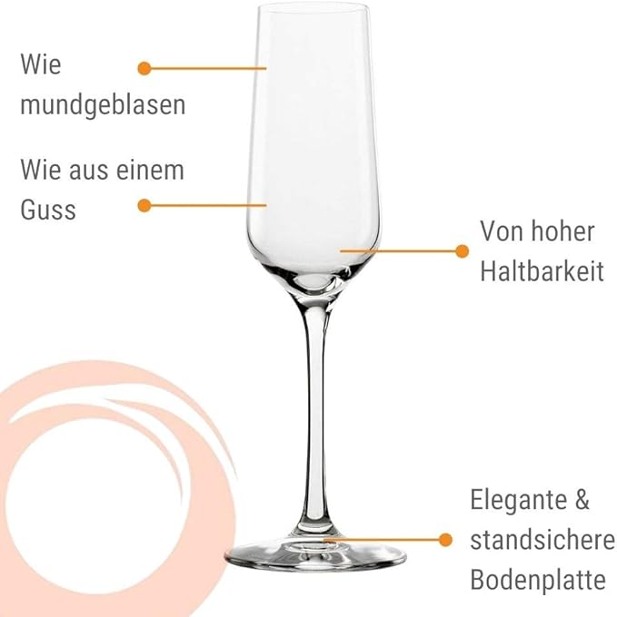 - IDEAL 6-PIECE SET: This set includes 6 elegant champagne glasses with a seamlessly pulled stem. With a capacity of 200 ml, the glasses provide enough space for perfect aroma development. Perfect for festive occasions or as a gift for connoisseurs!