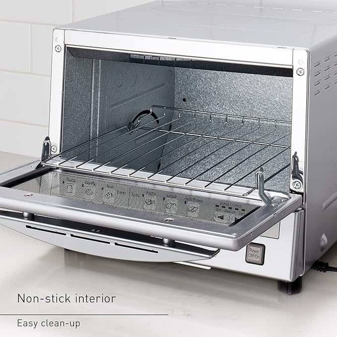 - Safety Features: Toaster ovens baking rack is connected to the oven door to smoothly pull the rack toward you as the door is opened; auto shut-off helps prevent overcooking and burning