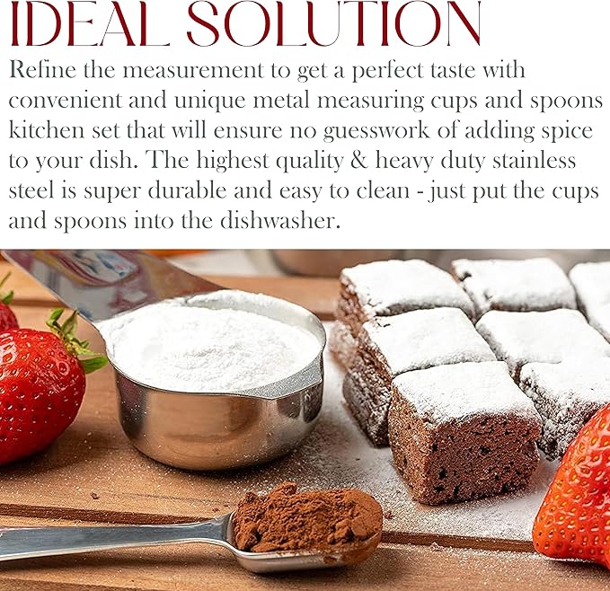 - COOK SAFELY WITH STEEL: You don’t want silicone or BPA-infested plastic to touch your cooking. We know that, so don’t worry: all of our measuring cups are crafted from durable, one-piece (no welds) dishwasher-safe stainless steel.