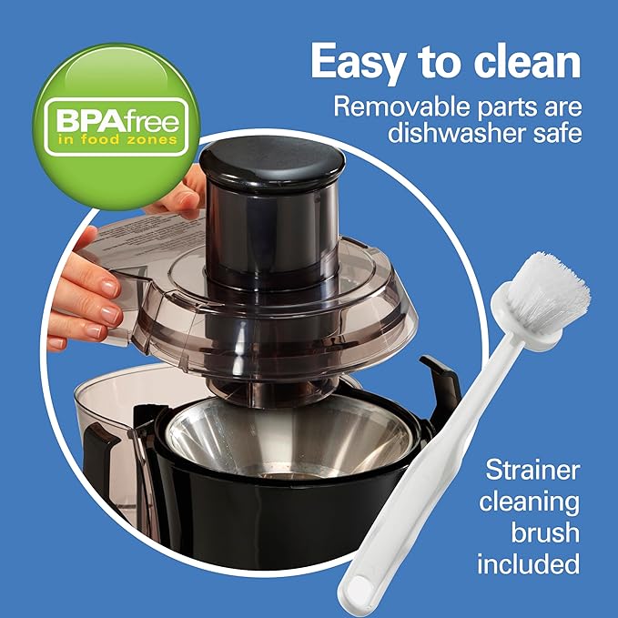 - EASY TO CLEAN: Cleaning up after using this fruit juicer machine is easy with the convenient strainer cleaning brush. The pulp bin, juice bowl, lid, and pusher are all dishwasher safe.