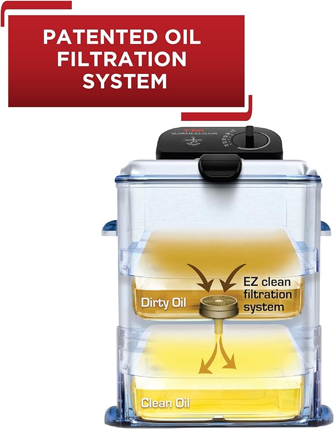 - Oil Filtration System: Advanced technology automatically filters and stores oil in a sealed container ensuring easy cleanup and cost savings through reusable oil. Enjoy hassle-free deep frying with this innovative feature.