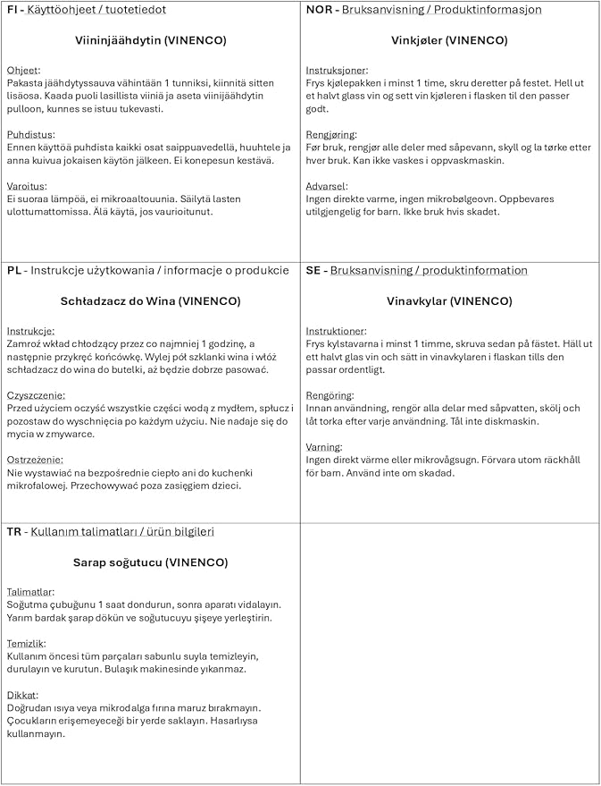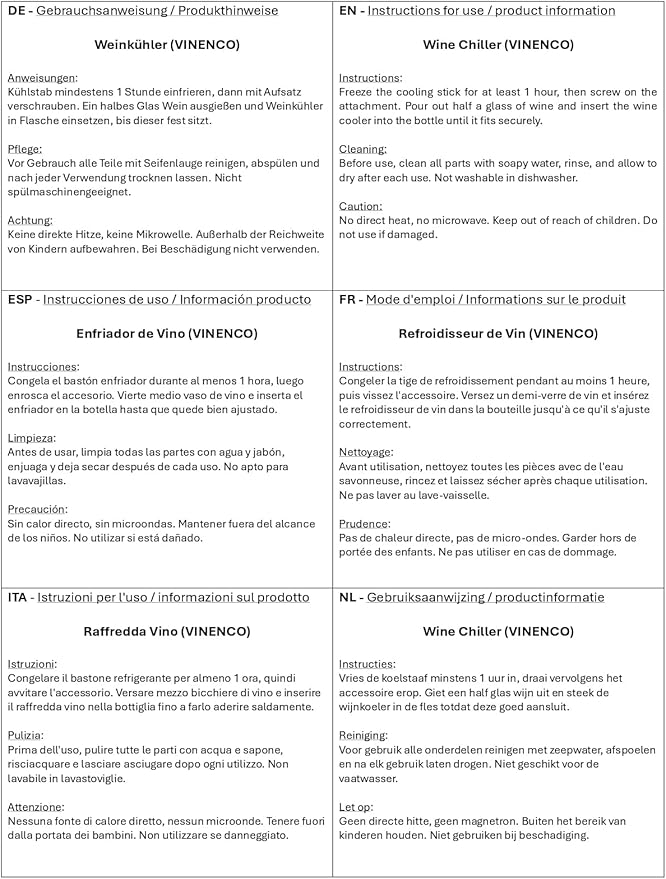 - š· ššŖšš„š šŖšš”š”šš”š: #1 WINE CHILLER INNOVATION ā The VINENCO 3-in-1 Wine Chiller with drip-free pourer and aerator function will keep your pre-cooled wine at optimum drinking temperature and refresh red wine to ideal cellar temperature. Get your BONUS FOIL CUTTER, STOPPER, STORAGE POUCH and WINE TASTING E-BOOK with every order.