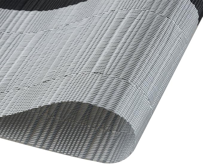- Material: woven by premium PVC coated polyester. Heat insulation up to 185°F(85℃), wear resistance. No shedding of lints. No color fading. Odorless. Kids friendly. Not easy to deform during use at room temperature. Durable and look always new even after long time use. But please note do not put hot pots and pans on the mat, too much heat can cause the pvc mat to deform.