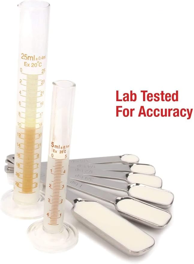 - BAKE WONDERFUL DESSERTS Baking great mouth-watering pies, cakes and cookies requires various measurements and these measuring spoons have the variety you demand with 6 (six) of the most common spoon sizes in standard US and metric measurements, lab-tested for accuracy: 1 tablespoon (15 ml), 1 teaspoon (5 ml), 3/4 tsp (3.75 ml), 1/2 tsp (2.5 ml), 1/4 tsp (1.25 ml) and 1/8 tsp (0.6 ml). Plus, our thinner, narrow and elongated spoons fit easily into narrow spice jars and tins.