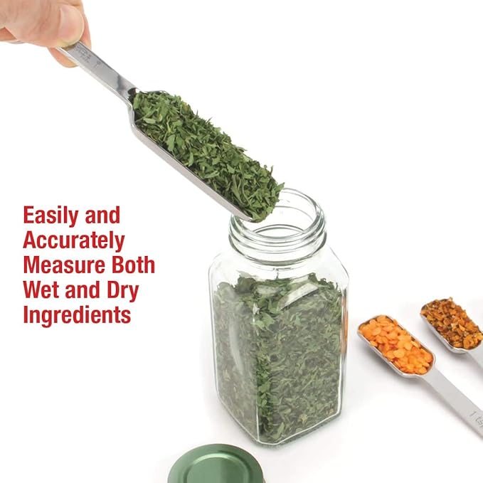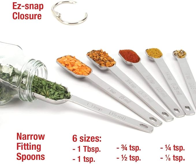 - SAVE TIME IN THE KITCHEN Not only is measuring liquid and dry ingredients (such as salt, pepper, spices, cumin, rosemary, etc.) a breeze, they are quick and easy to clean and dishwasher safe. Also, the EZ-Snap ring lets you quickly separate the spoons for sharing and the bonus leveler makes accuracy a breeze. Easy storage, can hang on the ring and they nicely nest together.