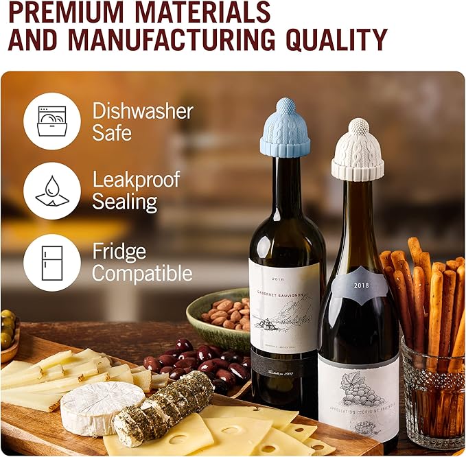- Sealed with a smile: Get a giggle out of topping off wine bottles with a beanie complete with jaunty pom pom.