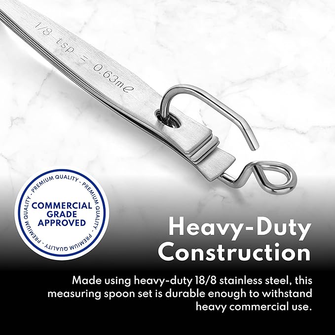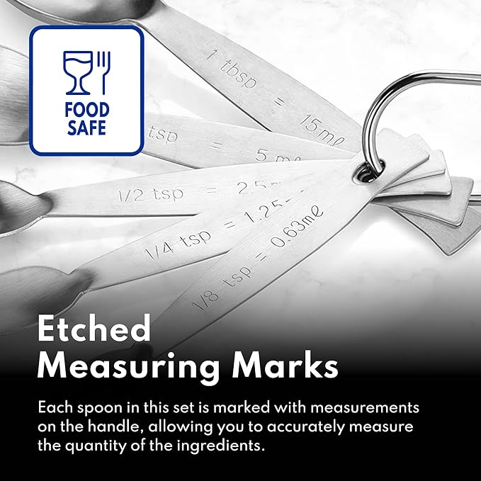 - Set includes: 1/8, 1/4, 1/2, 1tsp and 1tbs