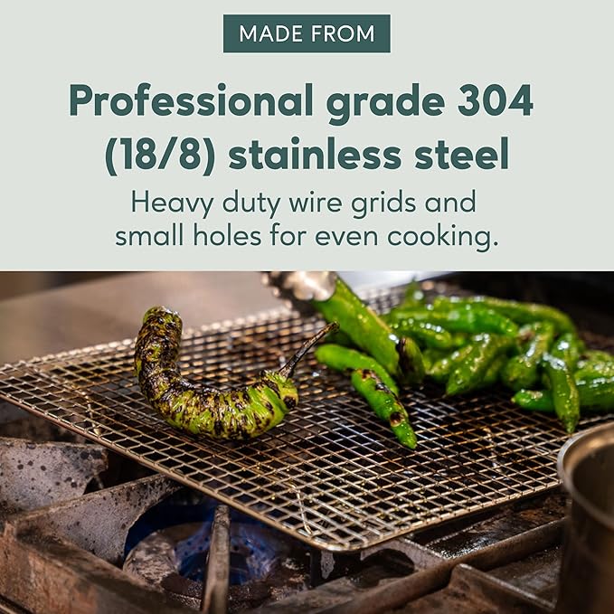 - HEAVY DUTY STAINLESS STEEL, STURDY DESIGN: Small cooling rack for quarter sheet baking pans are food-safe, professional grade 304 (18/8) stainless steel with strong, heavy duty wire grids, small holes, smooth no-snag edges, and a full 1 inch height resulting in greater all around airflow for even cooking, cooling and roasting every time