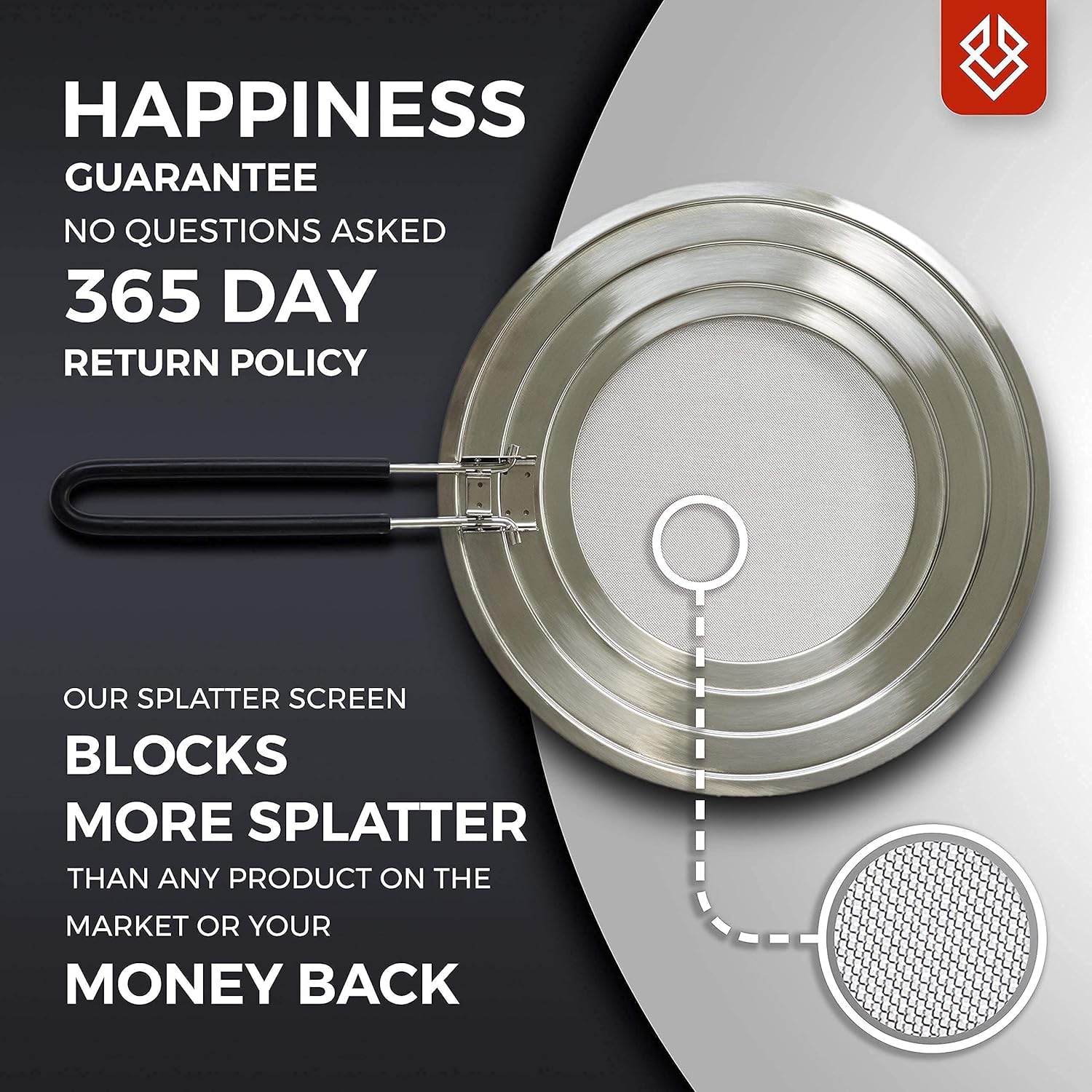 - MONEY-BACK GUARANTEE in the unlikely case that you’re not thrilled with the performance of our stainless-steel grease splatter cover. We’re so confident you’ll be happy with how it blocks oil splatter that we’ll give you a refund if you return it within 365 days.