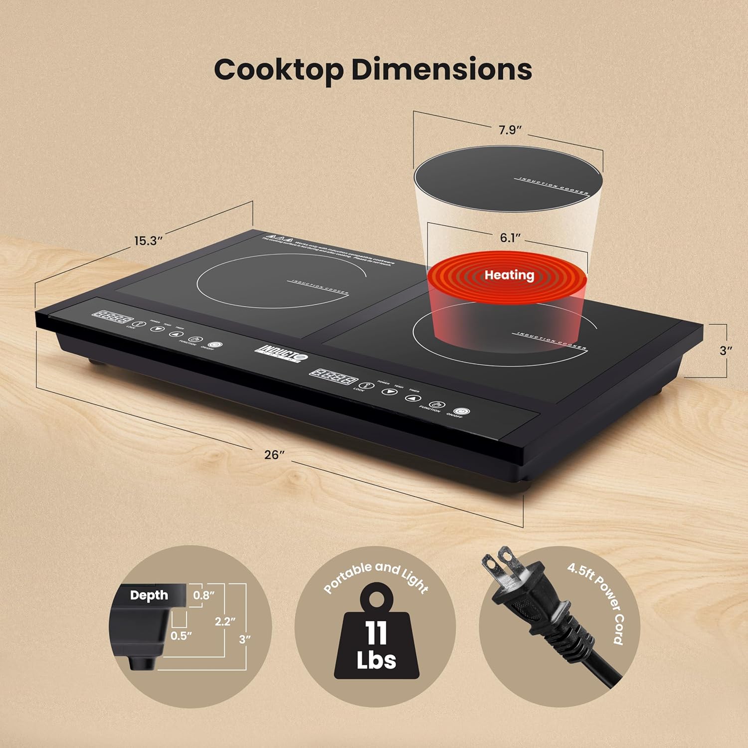 - LIGHT & SIMPLE - 26" Wide x 15.3" Deep x 3" Tall at 11 lbs this unit is light, portable and powerful. Touch sensitive controls with intuitive functionality makes operating simple and easy. Two 8" diameter burners on a flat glass surface is easy-to-clean. Protective rubber feet allow the unit to safely be placed on top of tables.