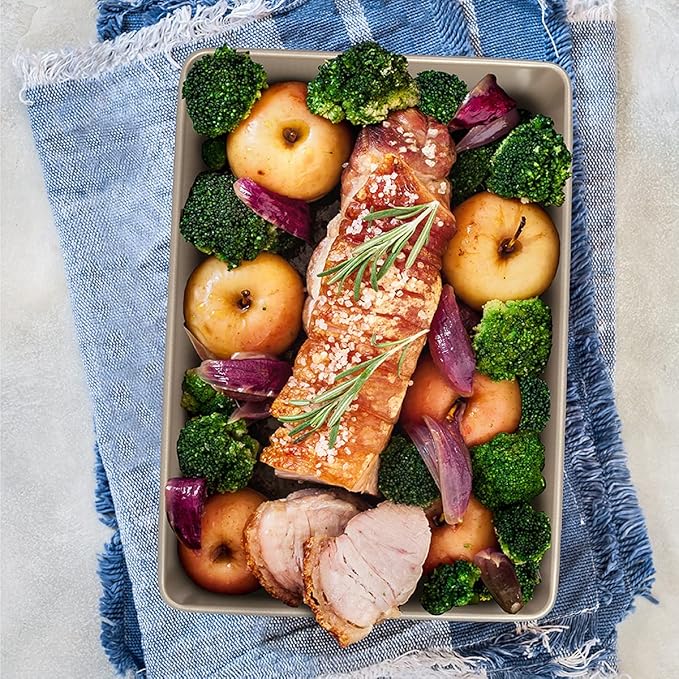 - HEAVY DUTY METAL PAN – Premium baking pan is made with a heavy gauge metal construction for lasting durability and high heat resistance up to 460ºF.