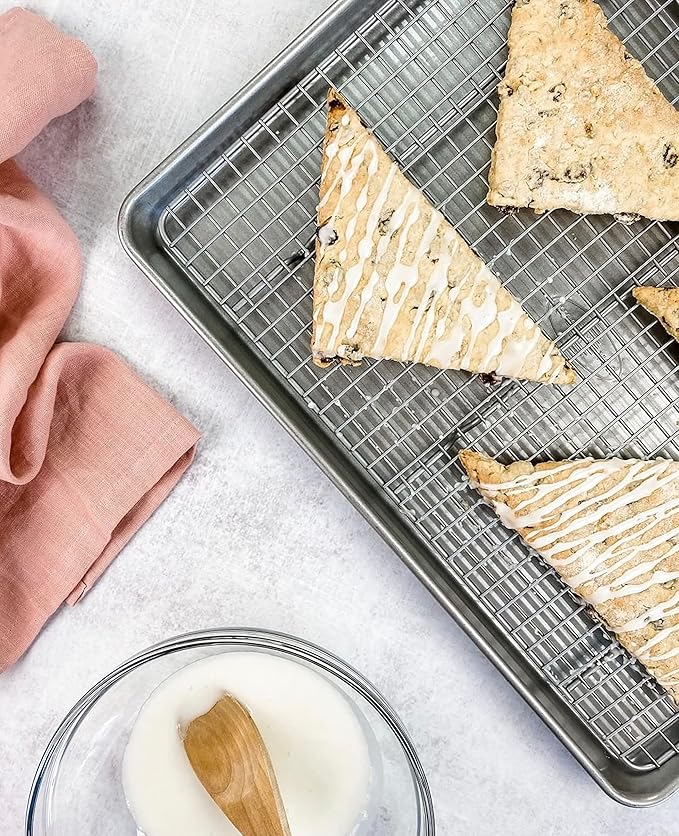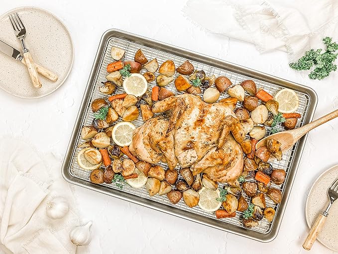 - Classic Extra large sheet pan and cooling rack for baking and roasting cookies, vegetables, and cakes; commercial grade and heavy gauge aluminized steel with a Limited Lifetime