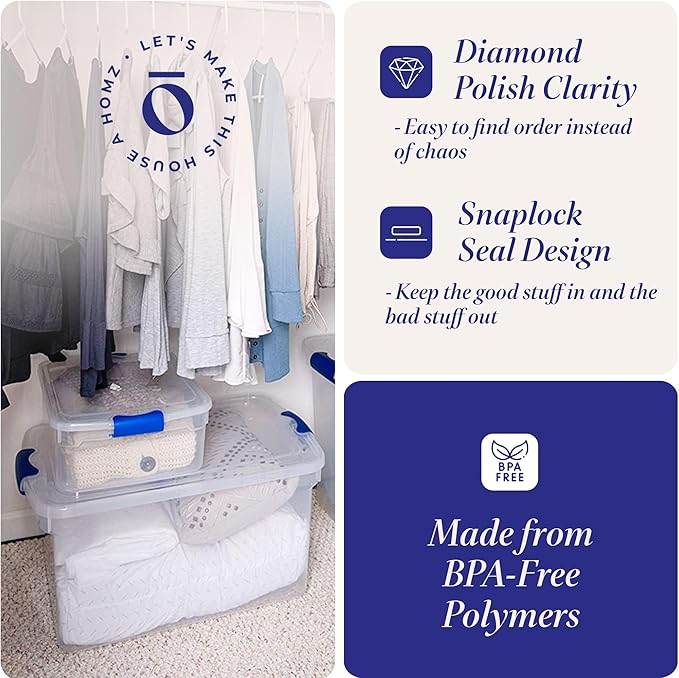 - No Wasted Space: Our set of plastic totes fit perfectly into any room. Keep your treasures safe with our locking sides and locate your items in a snap with clear sides