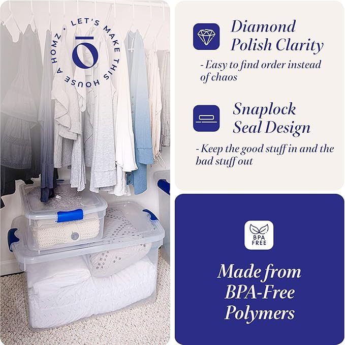 HOMZ 2-Pack Latching Lid, Clear Plastic Storage Organizer Bins, 112 Quart, Blue Latch - Stackable Organizing Containers for Home, Garage, and Office