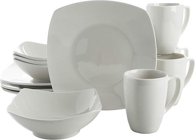 Gibson Home Amelia Court Porcelain Chip and Scratch Resistant Dinnerware set, Service for 4 (12pcs), White (Soft Square)