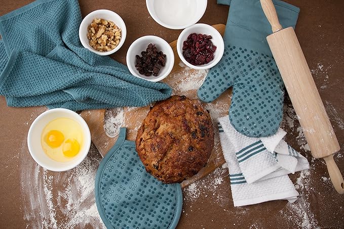 - 3 PIECE KITCHEN ACCESSORY SET: Collection includes 1 oven mitt (12.5 in x 7 in) and 2 pot holders (7 in x 9 in). Our oven mitts are soft and comfortable and are designed to fit a right or left handed user. Use for everyday baking and cooking in your home.