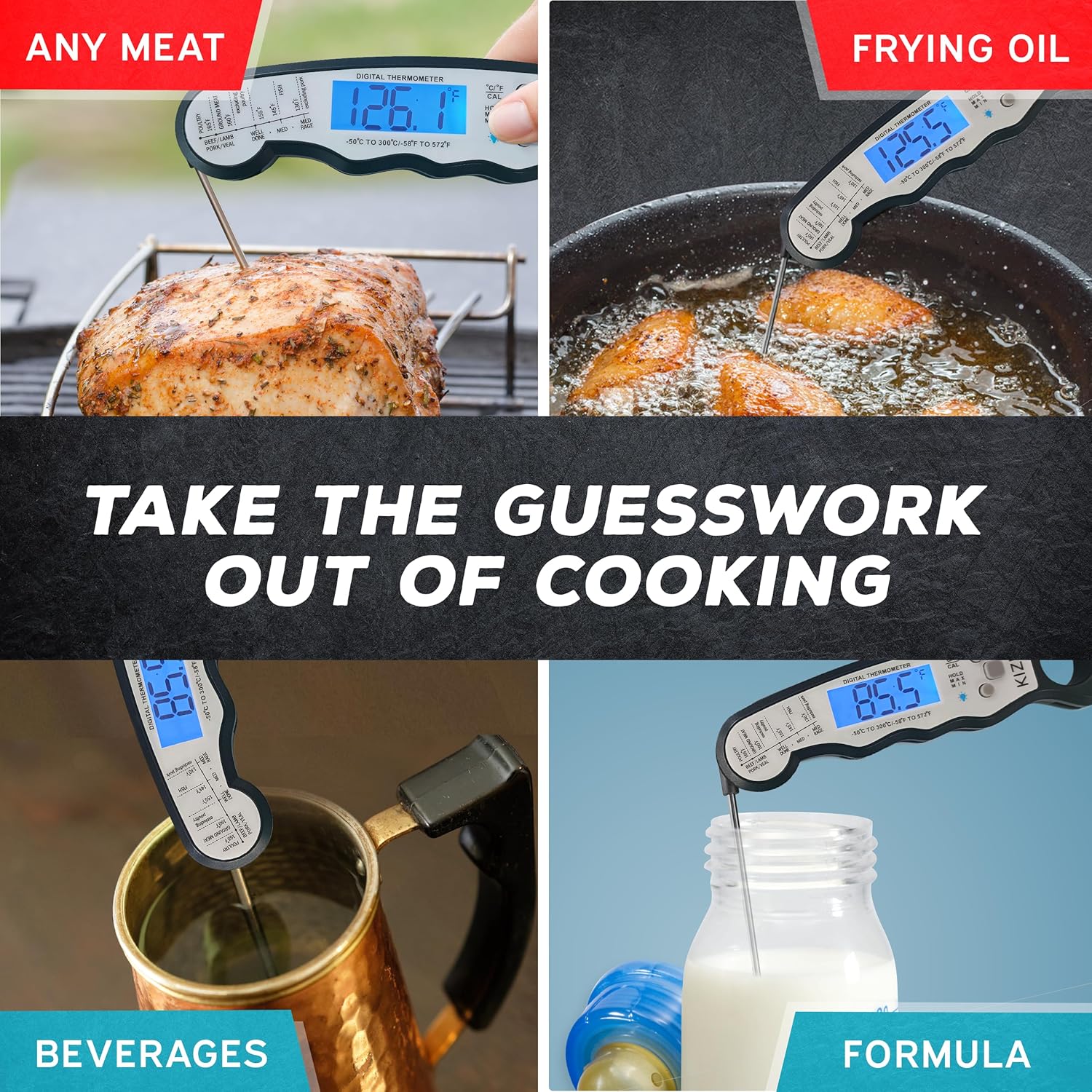 - MULTI USE KITCHEN THERMOMETER - A good cooking thermometer is one that can do it all. The KIZEN food thermometer works for grilling and roasting meat, baking bread, making candy, and more.