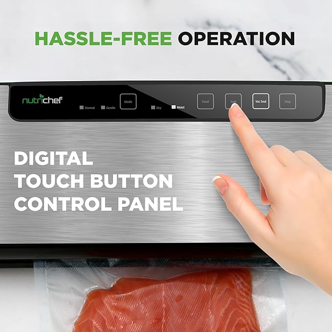 NutriChef Food Vacuum Sealer Machine, Stainless Steel Automatic Air Sealing System for Dry/Moist Foods, LED Touch Controls, Includes Vacuum Hose, Bag Roll and Wine Stopper, 110W Suction Power, 14"x6"