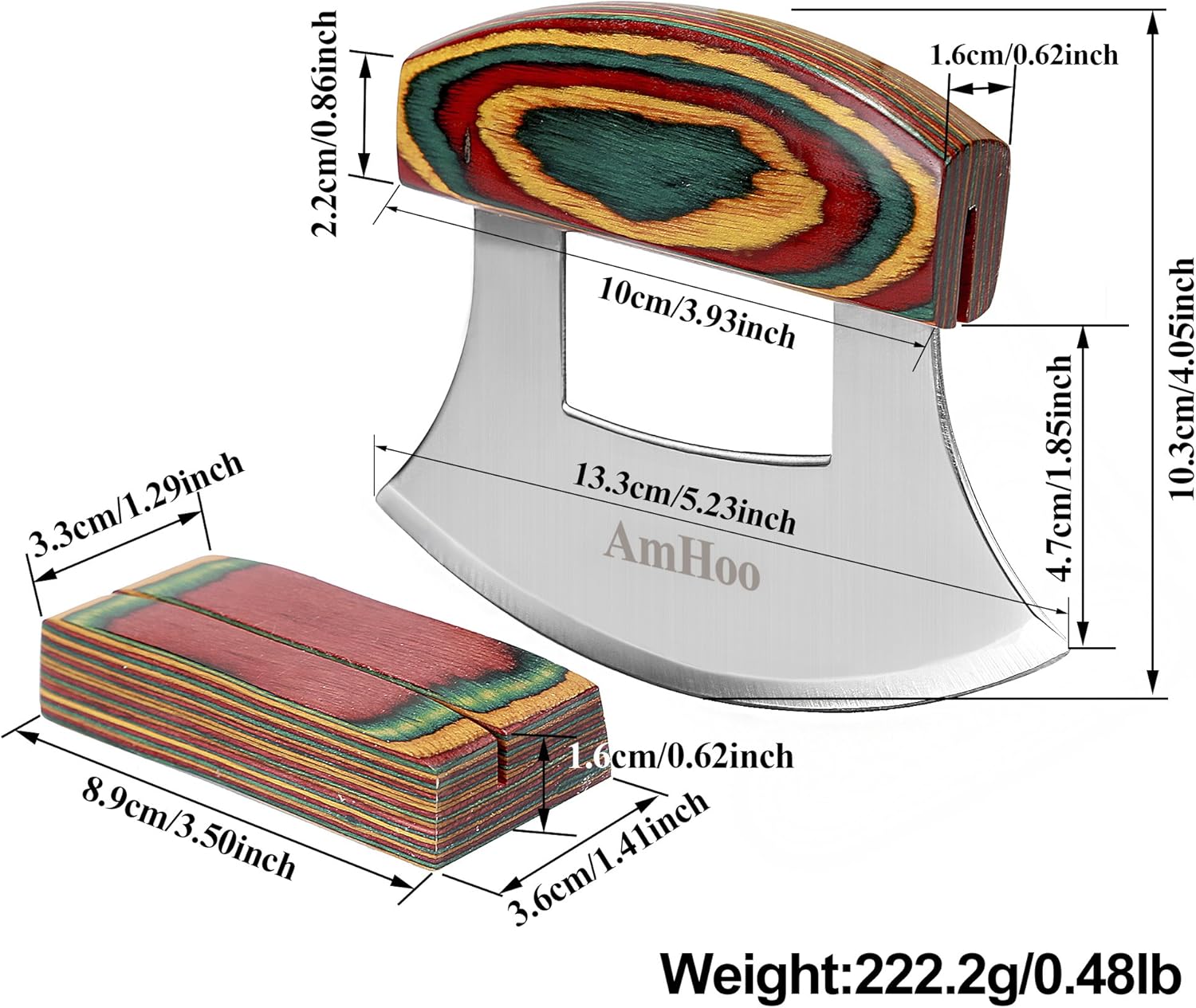 Amhoo Pizza Cutter Chef Mezzaluna Ulu Knife Handle Color Wood Grip Sharp Rocker Slicer Stainless Steel Blade Salad Onion Vegetable Chopper with Holder Base Christmas Gifts