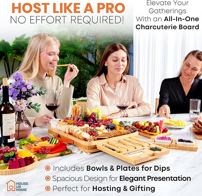 Large Bamboo Charcuterie Boards Gift Set with 4 Hidden Drawers, Cheese Knives, Ceramic Bowls & Plates, Recipe Book, Perfect House Warming Gifts New Home
