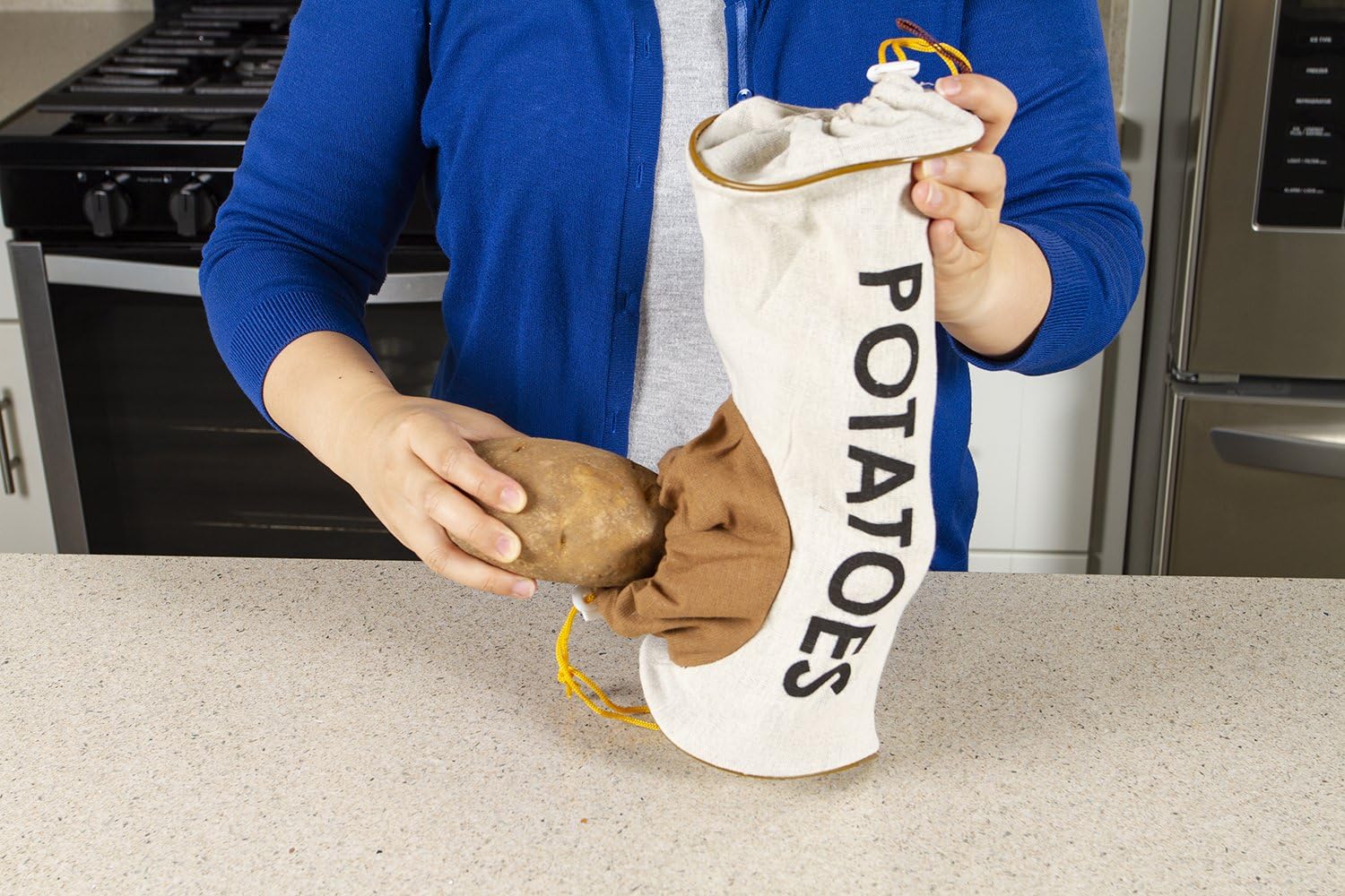 - TOP AND BOTTOM DRAWSTRING: Add potatoes easily with the drawstring on the top, and always make sure you're using the oldest first by removing potatoes using the drawstring on the bottom.