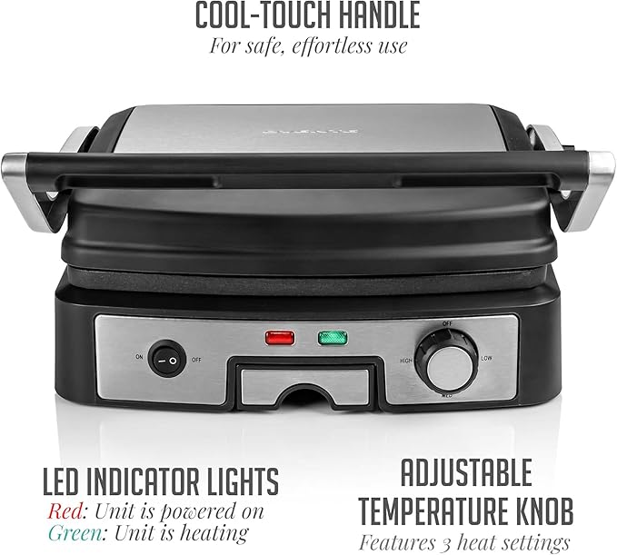 - Special Feature : Opens 180 Degrees, Non-Stick Coating, Thermostat Control, Cool Touch Handle, Indicator Lights