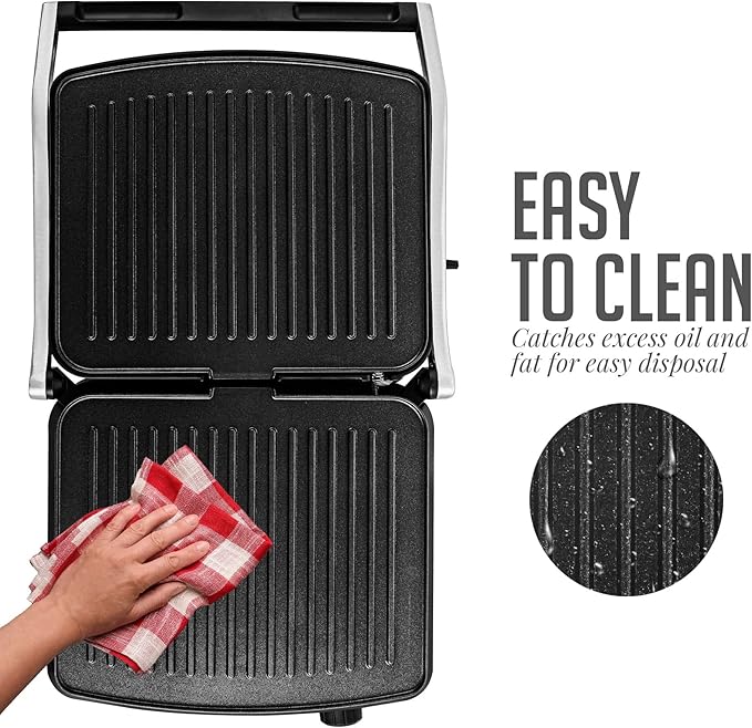 - EASY TO CLEAN – Clean the non-stick coated plates easily with the FREE brush that comes with the grill. Includes a removable drip tray that collects excess fat and grease for easier cleanup and disposal.