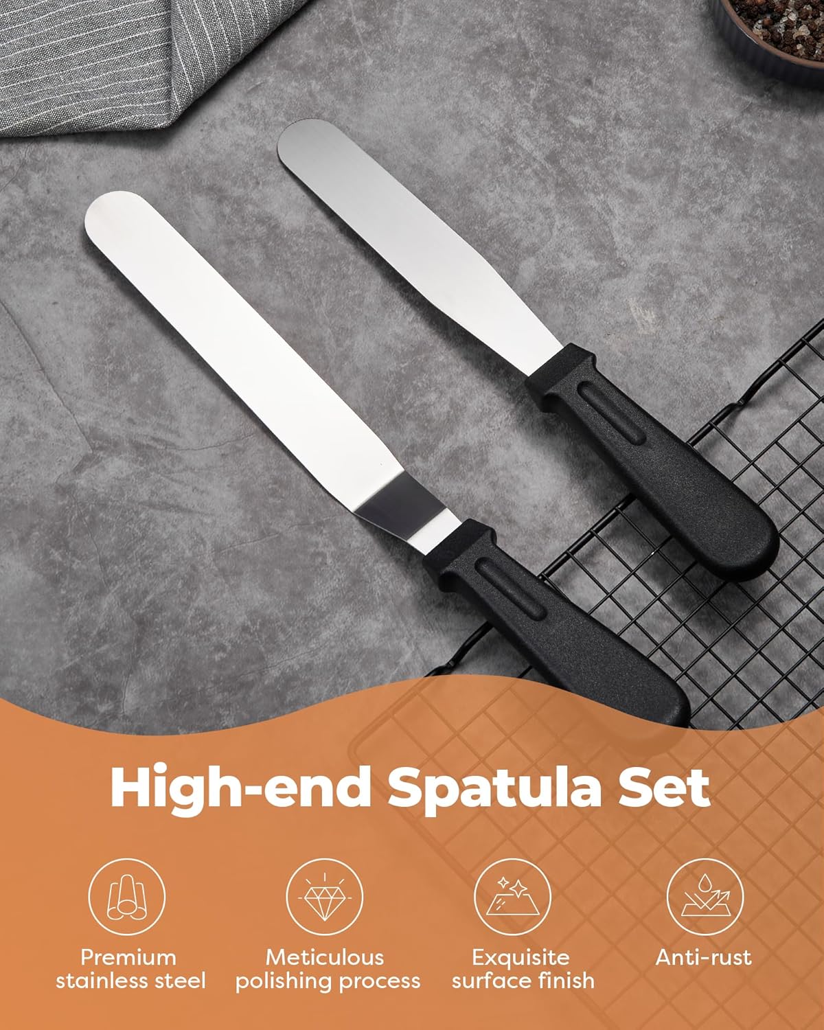 - Complete Cake Baking Tools: Get ready to bake with ease using our all-in-one cake decorating supplies kit! It includes everything you need to get started: non-slip 11-inch aluminium alloy cake turntable for decorating, 24 numbered piping tips, 2 reusable pastry bags, angled offset and straight icing spatulas, 3 stainless steel cake scrapers, 1 flower nail, and 2 standard couplers.