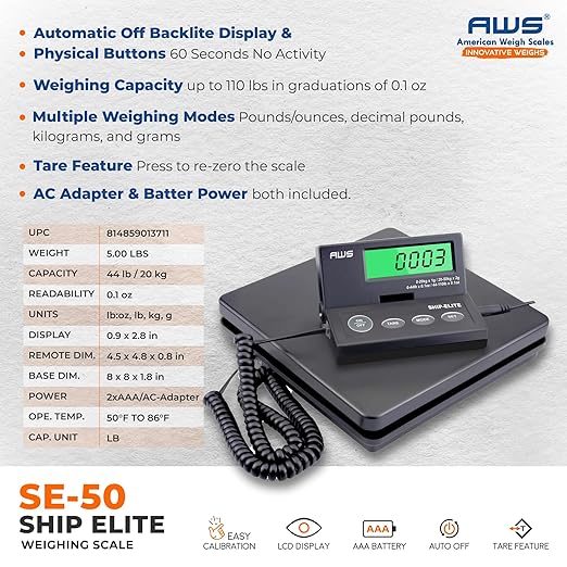 American Weigh Scales Digital Shipping Scale | Highly Accurate Multifunctional Postal Package & Luggage Weighing Scale | 110 lbs x 0.1 oz | Backlit LCD | Battery & AC Adapter | Compact Platform