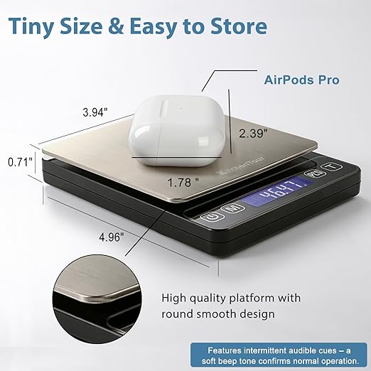 - #LIGHTWEIGHT & COMPACT DESIGN# - Overall size: 4.96" x 3.94" x 0.71".​The sleek aesthetic complements any kitchen decor, cleans quickly and stores easily. The touch activated keys also make for an elegant and clean design. With the back-lit reverse LCD display, weighing is quick and easy.