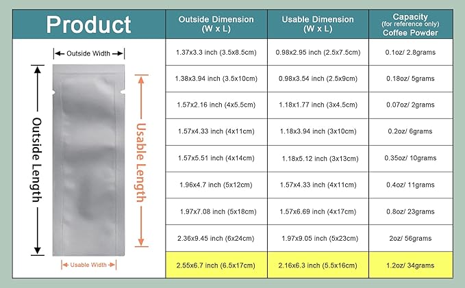 - The size you see is the outside dimension of the bag and the available dimension is about (outer wide - 0.4 inch) x (outer length - 0.4 inch); 3.34 mil( one side) thickness