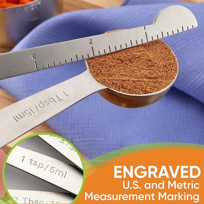 - Built to Last - These must-have kitchen tools are rust-resistant and made of heavy duty premium stainless steel. Each cooking measuring sets' measurements are engraved, so they stay clearly marked and will not fade or rub off, no matter how long you use them.