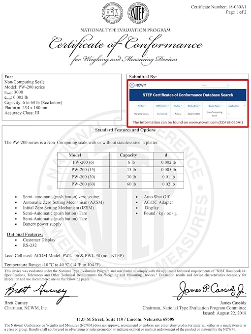 - 1 Year Warranty, Made In KOREA, Lb/Oz/Kg/grams switchable, Easy Operating, NTEP Approved Legal for Trade, Coc #18-060A1, Capacity 30lb x 0.01lb, 480oz x 0.2oz, 15000g x 5g, 15kg x 0.005kg