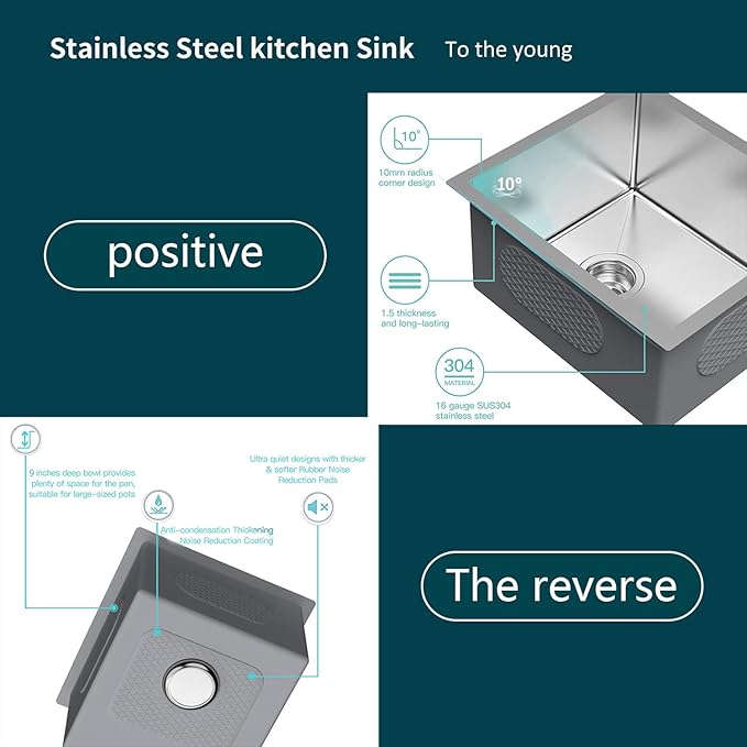 - User-Friendly Design: Our bar sink designed with a soundproof pad to significantly reduce noise, a unique anti-condensation coating to protect your cabinets from moisture, and X-shaped drain pipes for smooth water flow. These innovative features make your kitchen life more refined and efficient