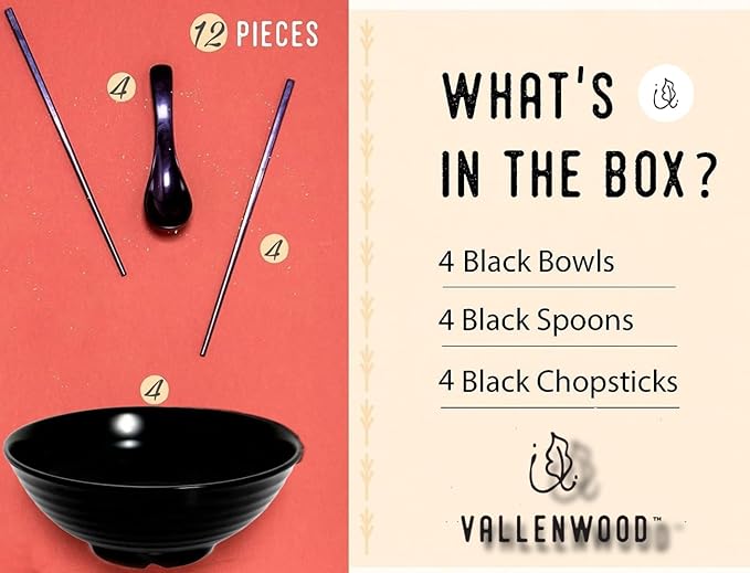 4 Ramen Bowls, 12 pieces Pho set. All Black Asian Japanese soup. Utensil: Spoons And Chopsticks kit. Melamine. Large 37 oz. Noodles, Rice, Udon, Thai, Chinese, Korean, Wonton, Miso