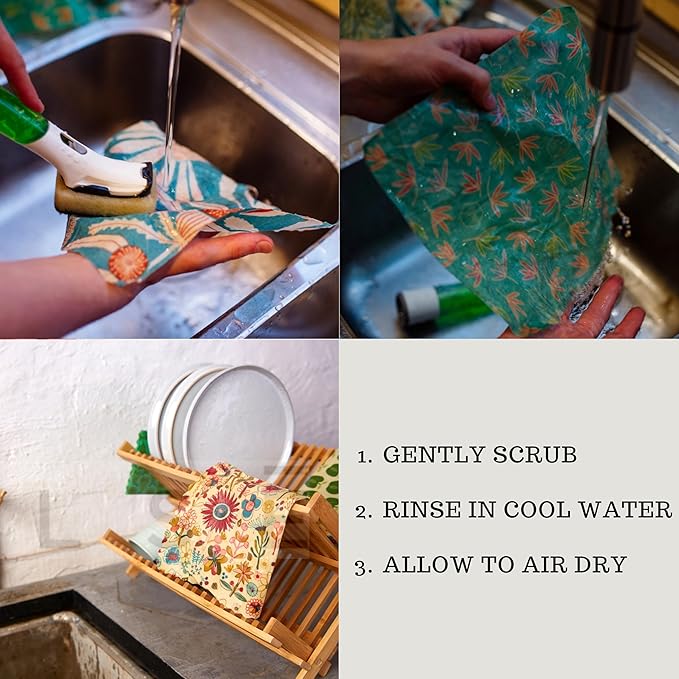 - WRAP WITH EASE - Use the warmth of your hands to shape and mold your Honeybee Wrap beeswax wraps over food and dishes. Avoid heat, raw meats and seafood. To clean, just wipe with cool soapy water, rinse and hang to dry. Food storage and wrapping made fun, simple and green!