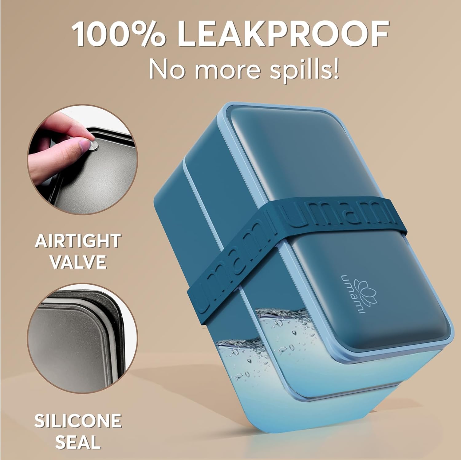 Umami Bento Box Adult All-In-1 w/4 Utensils, Big Sauce Jar, 2 Dividers, 100% Leakproof, Microwave & Dishwasher Safe, Stackable Bento Lunch Box Containers for Men/Women, Denim Blue, 40 oz