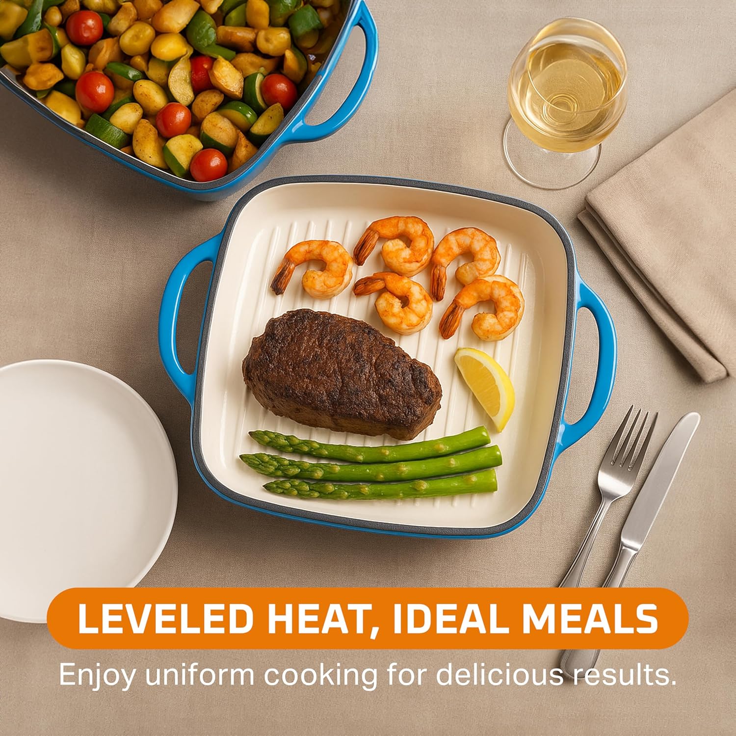 Bruntmor 2-in-1 Pre-Seasoned Square Cast Iron Dutch Oven with Dual Handles, Non Stick Pan with Grill, All-in-One Cookware Set, Cast Iron Casserole Dish with Lid for Braising Dishes,Whale Blue
