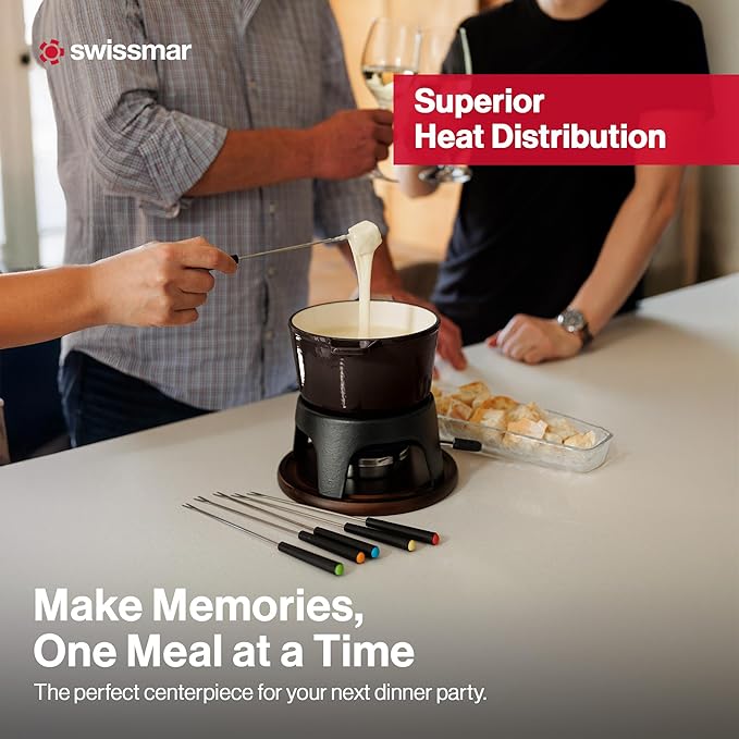 Swissmar Sierra Cast Iron Fondue Set, 1.6 Quart / 1.6 Liter – Perfect for Meat, Cheese, & Chocolate Fondues – Ideal for Family Bonding & Hosting Gifts - 12-Pieces, Metallic Black