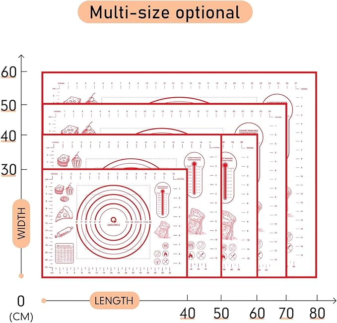 - Premium Silicone Bakig Mat: Our silicone pastry mat made of 100% Food-Grade Silicone, no harm to the body, safe use for temperatures of -45 degrees F (-43 C) to 450 degrees F (230 C), no unpleasant chemical odors, providing you more time to enjoy your creations.