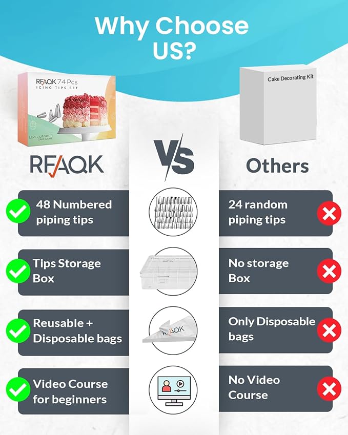 - Essential Cake Decorating Tools: Getting ready to decorate but not sure what tools you need? RFAQK offers complete baking supplies set that includes everything you need to start decorating Cakes like a PRO! 48 Numbered Easy to Use icing tips with E-Book in PDF (User Guide for beginners) & Booklet showing outcome of each Icing Nozzle, 2 Coupler, 20 disposable icing bags, 1 Reusable pastry bag, 1 Flower nail & lifter, Cleaning brush, Storage box that keeps everything organized