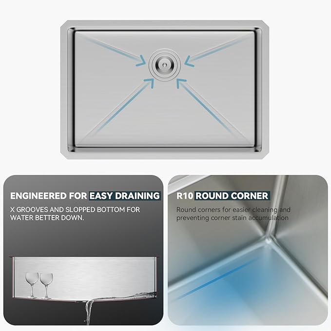- ROUND CORNER+BRUSED SURFACE -- This 28 inch single bowl kitchen sink is designed with R10 tight radius corners to prevent corner stain accumulation, more easier in cleaning. Commercial grade brushed surface makes our kitchen sink more functional in resisting scratches and more charming, fits well with all kinds of countertop.