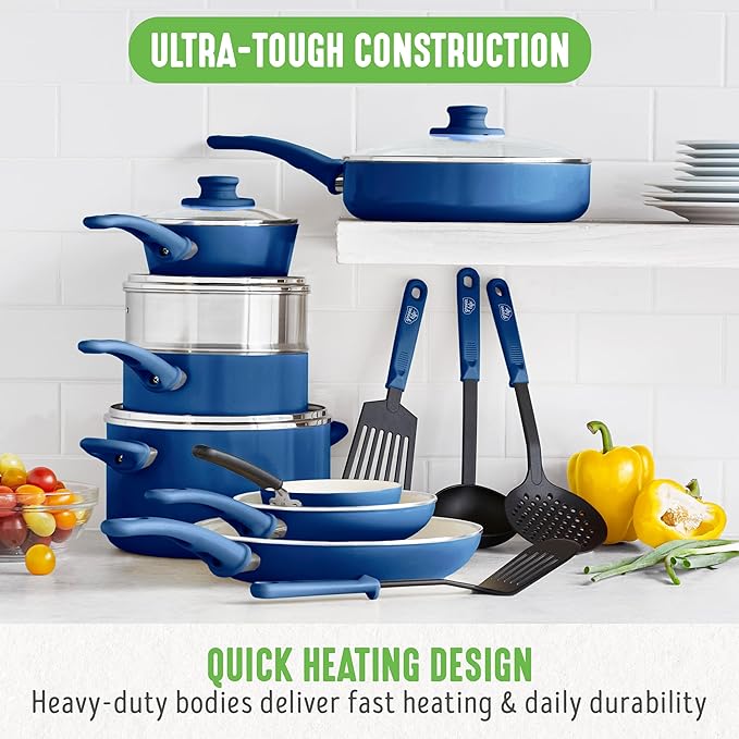 GreenLife 16 Piece Nonstick Cookware Set, Soft Grip Non-Toxic PFAS-Free Ceramic Pots & Pans, Dishwasher & Oven Safe, Frying, Sauce, Saute, Utensils, Glass Lids, Stay-Cool Handles, Wobble Free, Blue
