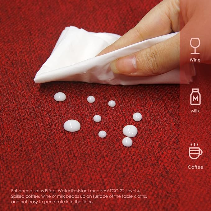 - 【Waterproof Table Cover】Enhanced Lotus Effect Water Resistant meets AATCC-22 Level 4. Spilled coffee, wine or milk beads up on surface of the table cloths, and not easy to penetrate into the fibers. You can absorb the droplets with napkin paper and you NO LONGER need to change and wash the table cloth every day