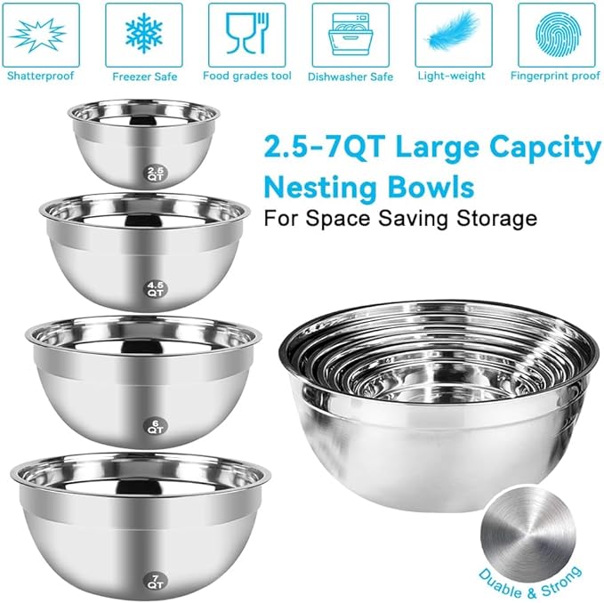 - 4 Stainless Steel Mixing Bowl Set: Come in different sizes 7, 6, 4.5, 2.5 Quart nesting bowls. Wide, flat rim ensures a sturdy grip for mixing, whisking, baking, cooking preparation and much more, This kitchen Bowls made of premium stainless steel, taste resistant, better shock-proof, rust-proof and easy to clean, could be nested storage for saving space.