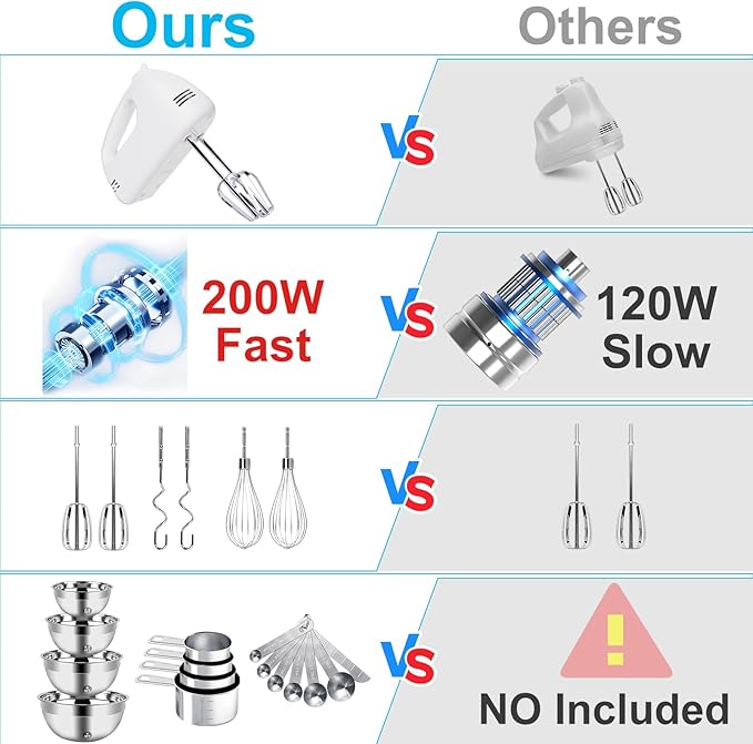 - Electric Handheld Mixer: With 200 Watt powerful motor and 5 speeds light weight hand held mixer can help to find the right speed for every mixing task. You can slowly increase speed for optimal mixing consistency and to prevent messes. The kitchen hand mixer include 2 stainless steel beaters,2 balloon whisks, 2 dough hooks. The attachments are dishwasher-safe and easy to remove with press button.