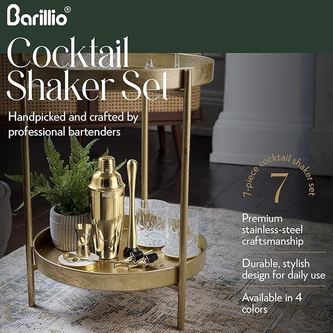 Barillio Gold Mixology Bartender Kit - 8 pcs Stainless Steel Travel Cocktail Shaker Set with Bag - Bar Tools Set with Martini Shaker, Drink Mixer Spoon & Mojito Muddler for Cocktails, Pourers & Jigger